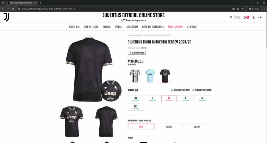 公式サイトにアクセスできたら購入商品を選び、カートに入れます。今回は評判の高い25/26シーズンの3rdユニを例として購入していきます。