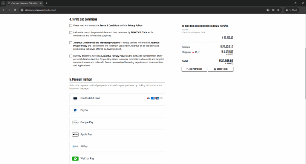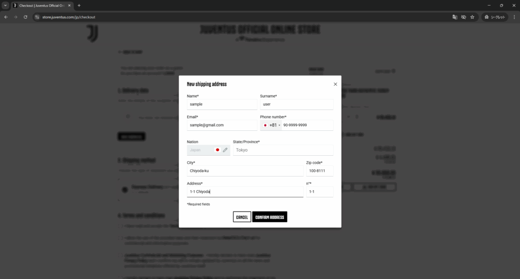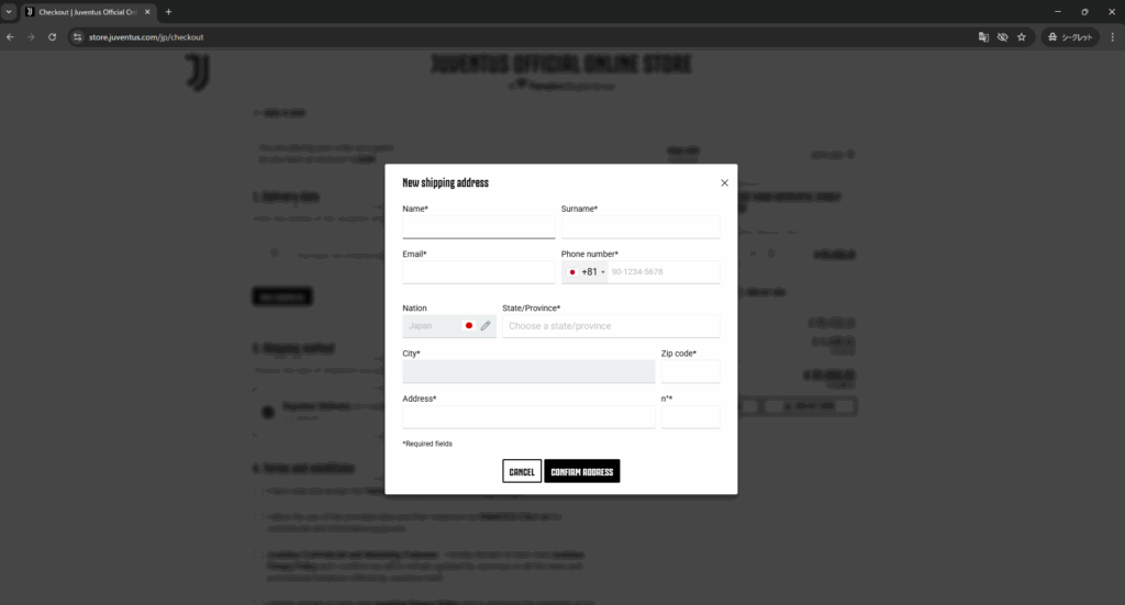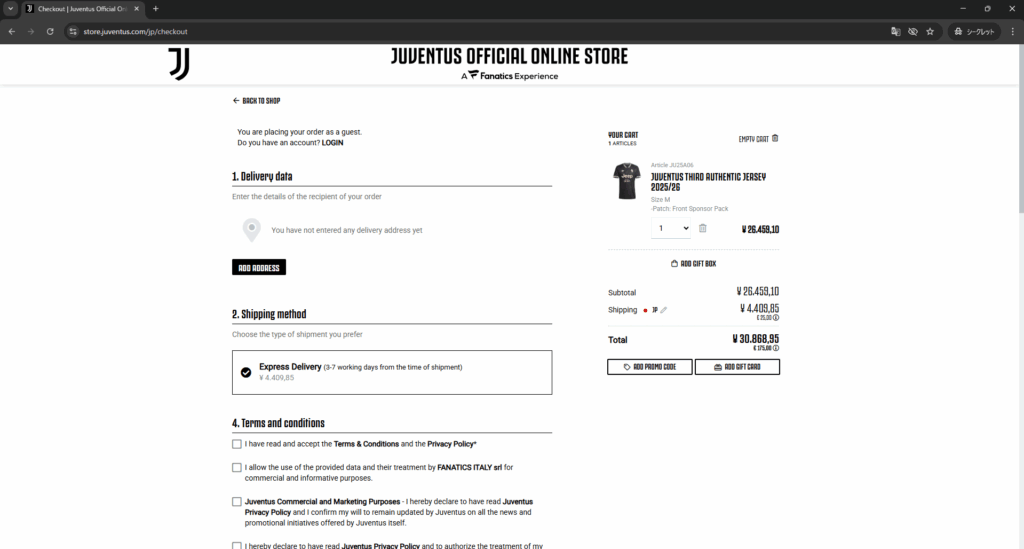 ユヴェントス公式サイトではアカウントを登録することで、住所などの入力の手間を省くことができますが、今回はアカウント登録しないパターンのみのご紹介です。
